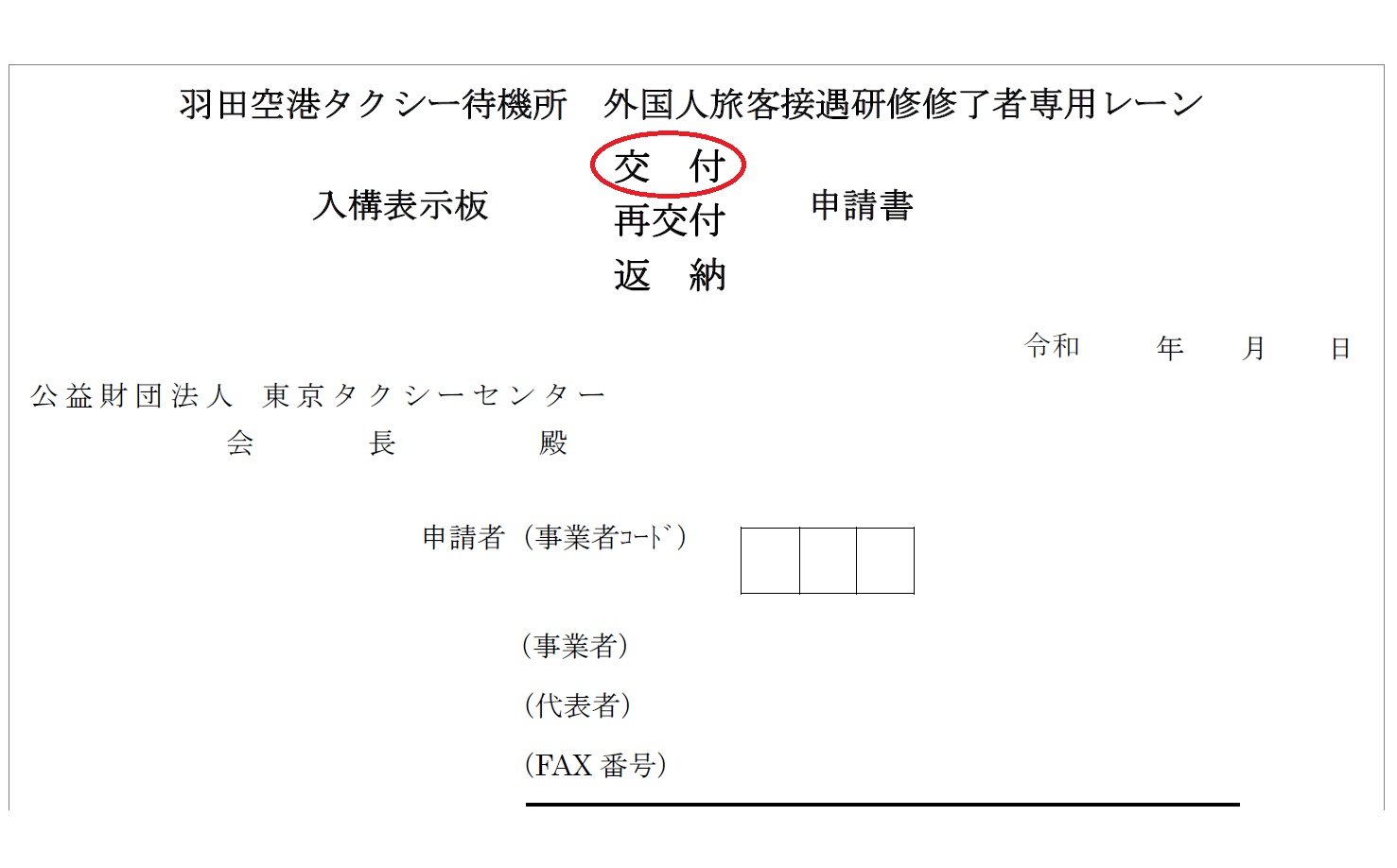 専用レーン入構表示板の交付については事業者(個人タクシー事業者にあっては、一般社団法人東京都個人タクシー協会)から入構表示板交付申請書の提出により研修修了者数分を限度として無償で交付します。ただし、再交付につきましては、有償となります。