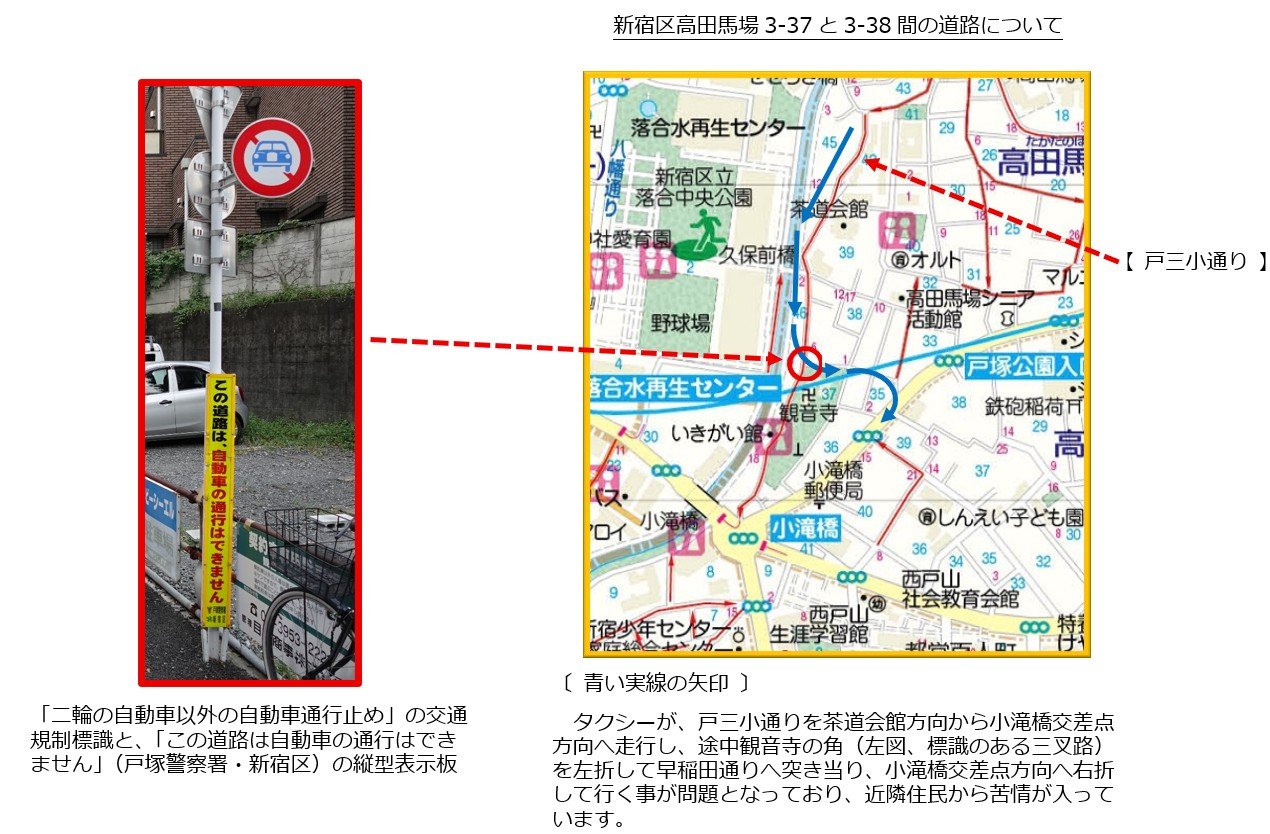高田馬場3-37と38の間は自動車が通行出来ない道路なのですが、タクシーが抜け道として通ってしまい近隣住民から苦情が入っています。