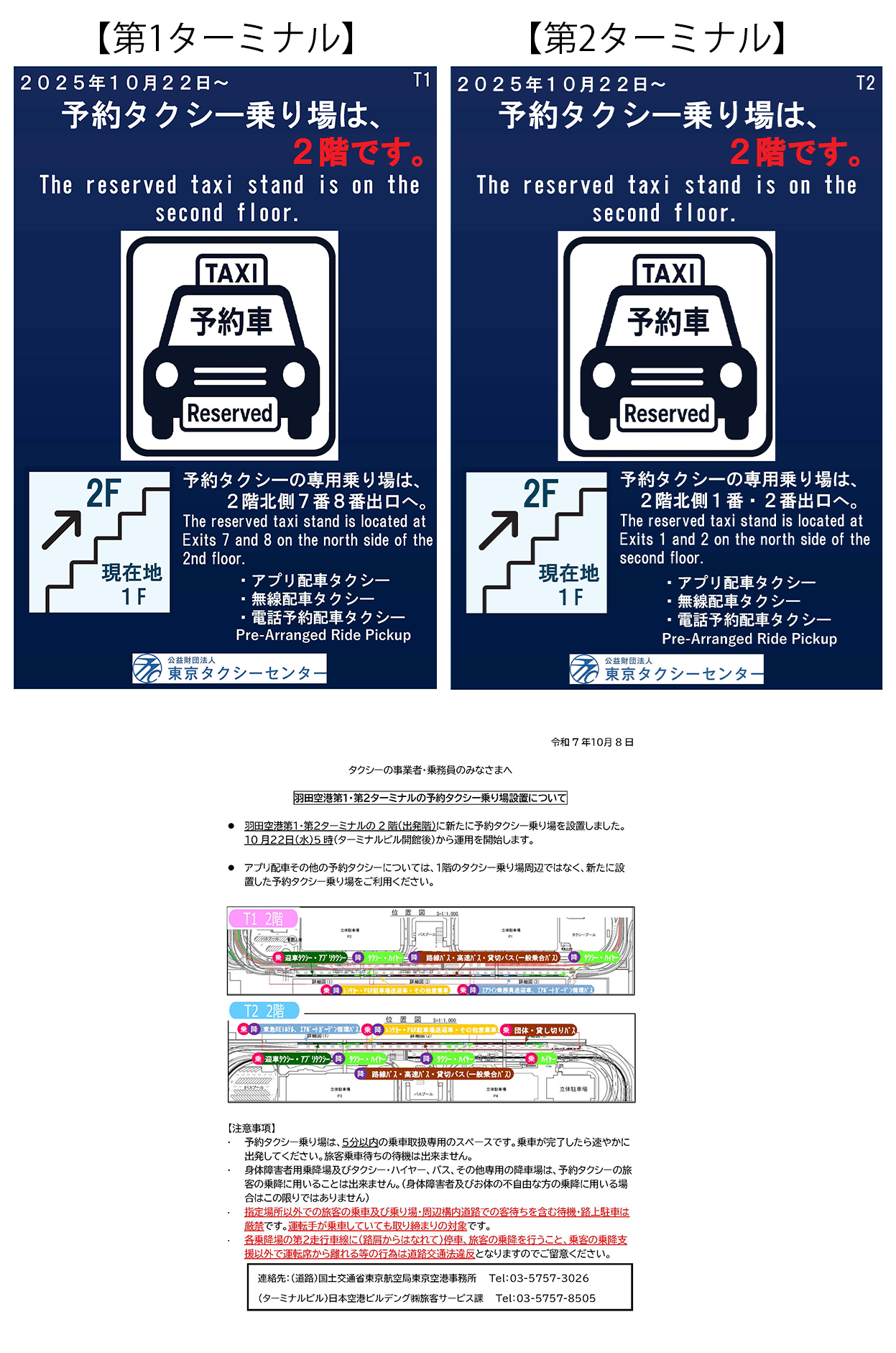 羽田空港第1・第2ターミナルに予約タクシー乗り場が設置されます。アプリ、無線、私的予約でタクシーをご乗車の場合は予約タクシー乗り場でお願いいたします。