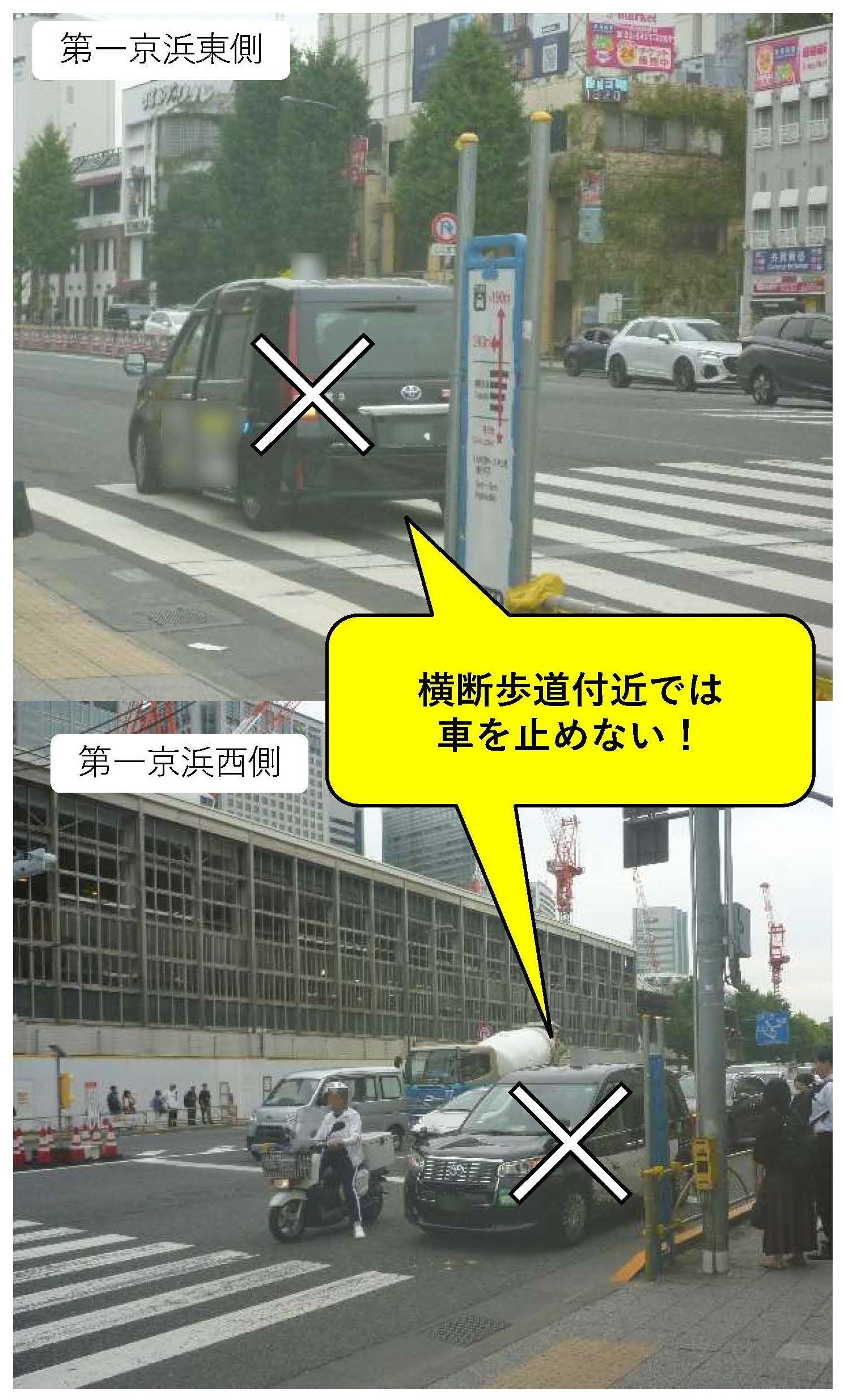 品川駅前では、タクシーの乗り降りに伴う駐車が非常に多く、たくさんの苦情が寄せられています。