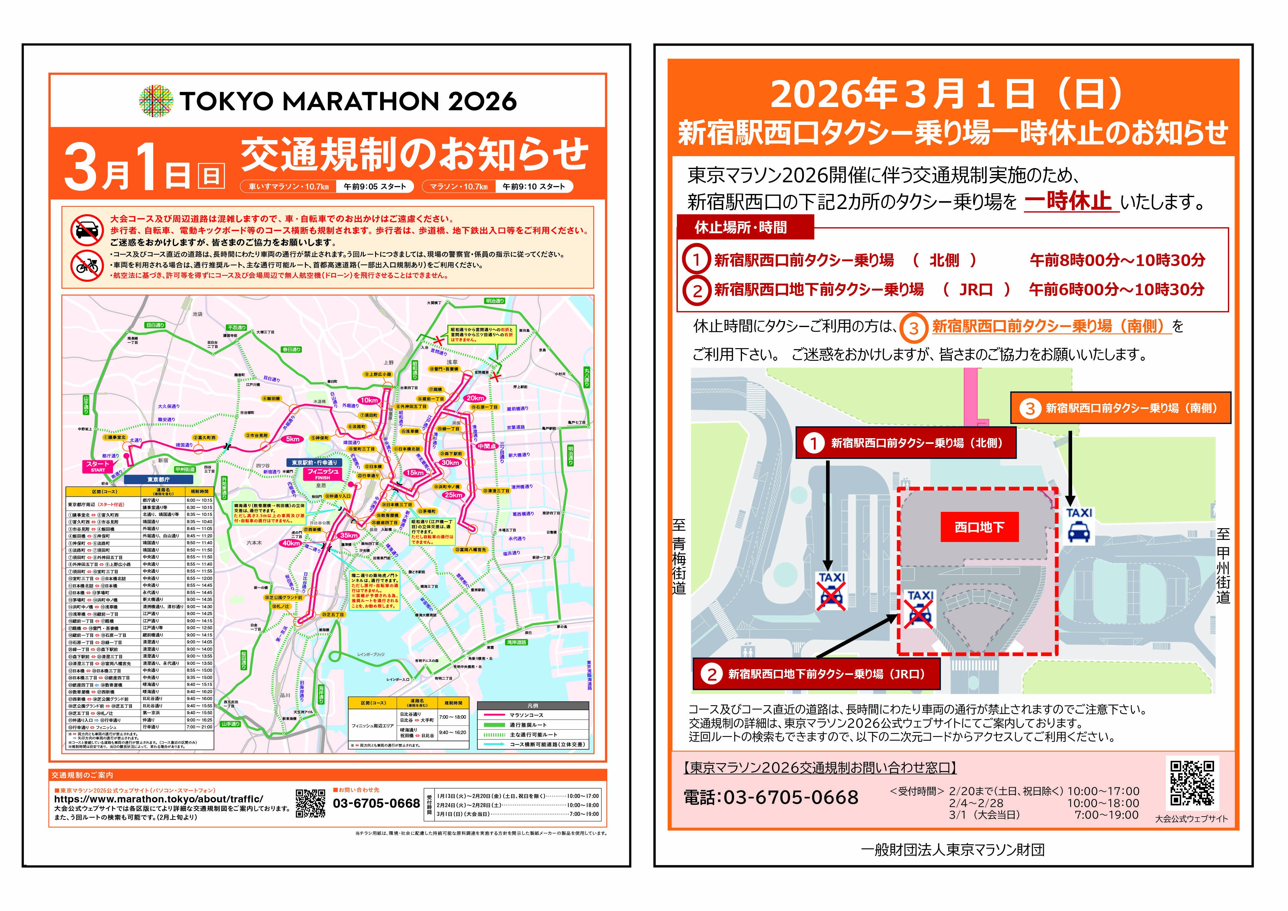 東京マラソン2026が令和8年3月1日(日)に開催されます。大会当日は、マラソンコース及び周辺道路での交通規制が実施されます。新宿駅西口でも、規制中2ヵ所のタクシー乗り場が一時休止となりますので、運転者の皆さんは規制を把握し、注意して営業してください。