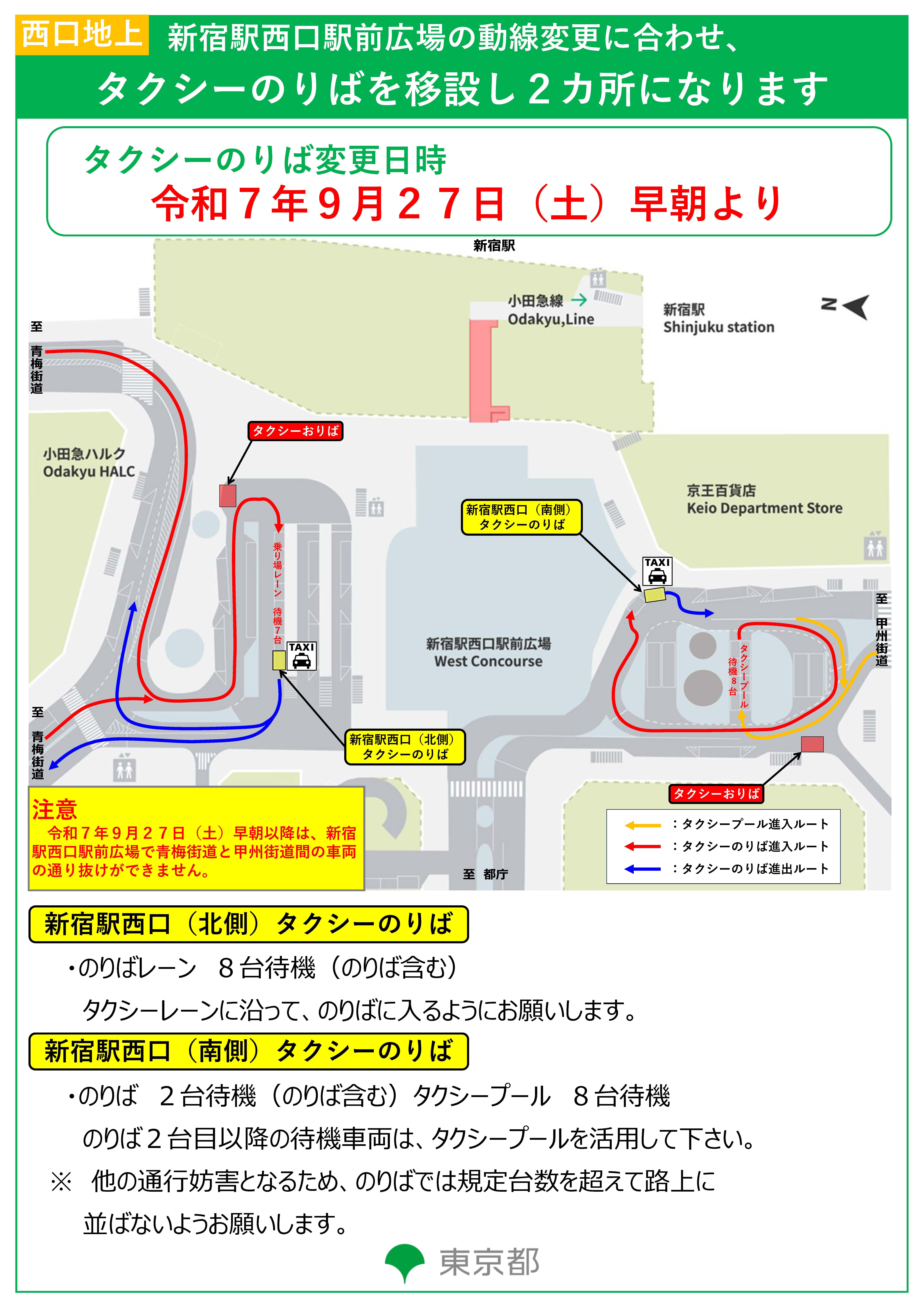 また、同日の早朝には新宿駅西口地上タクシー乗り場が移設し、南側・北側の2ヵ所になります。動線変更・乗り場移設について詳しくは、下記チラシをご覧下さい。